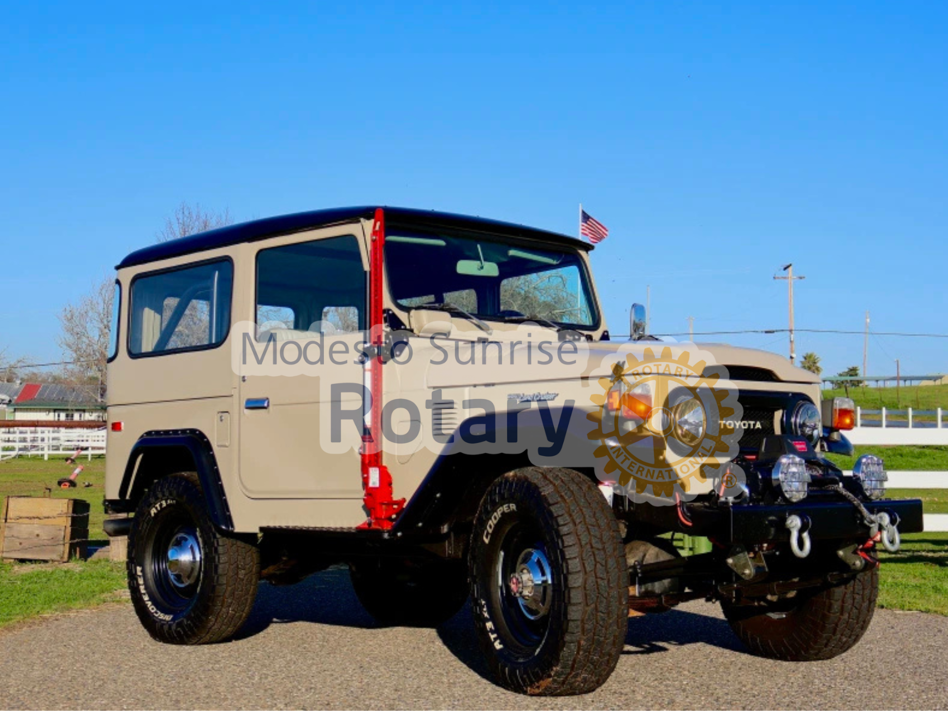 Win a Beautifully Restored 1975 Toyota FJ40 Land Cruiser. A legendary California 4x4, lovingly restored over 20 years — bulletproof 4.2L inline-six, 4-speed manual, and thoughtful modern upgrades. Every qualifying entry supports Modesto Sunrise Rotary Club Foundation scholarships, youth programs, and community service.